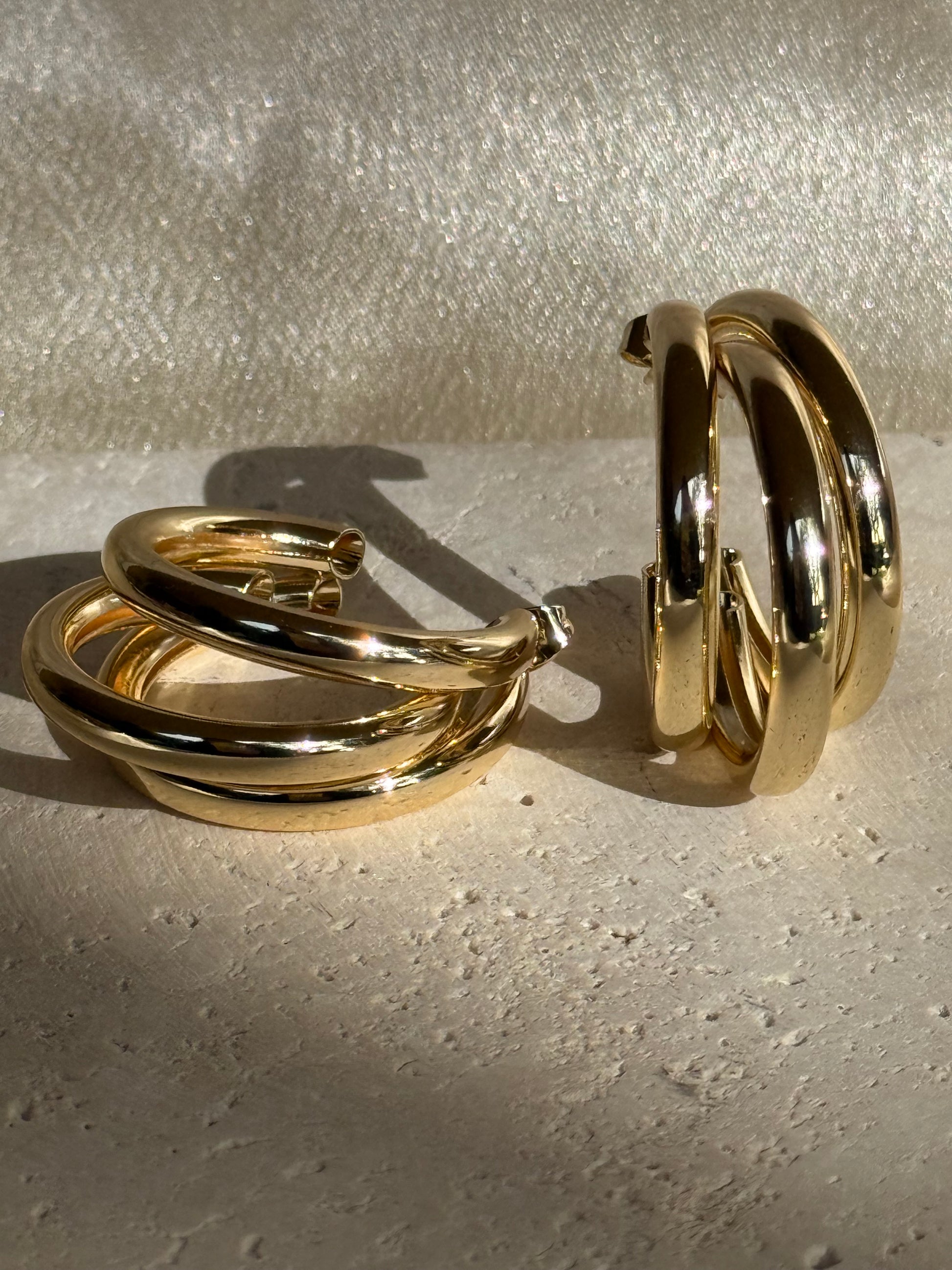 Stunning hoop earrings featuring a chic 3-in-1 layered effect for a bold, multidimensional look. Two sizes available: small or medium.