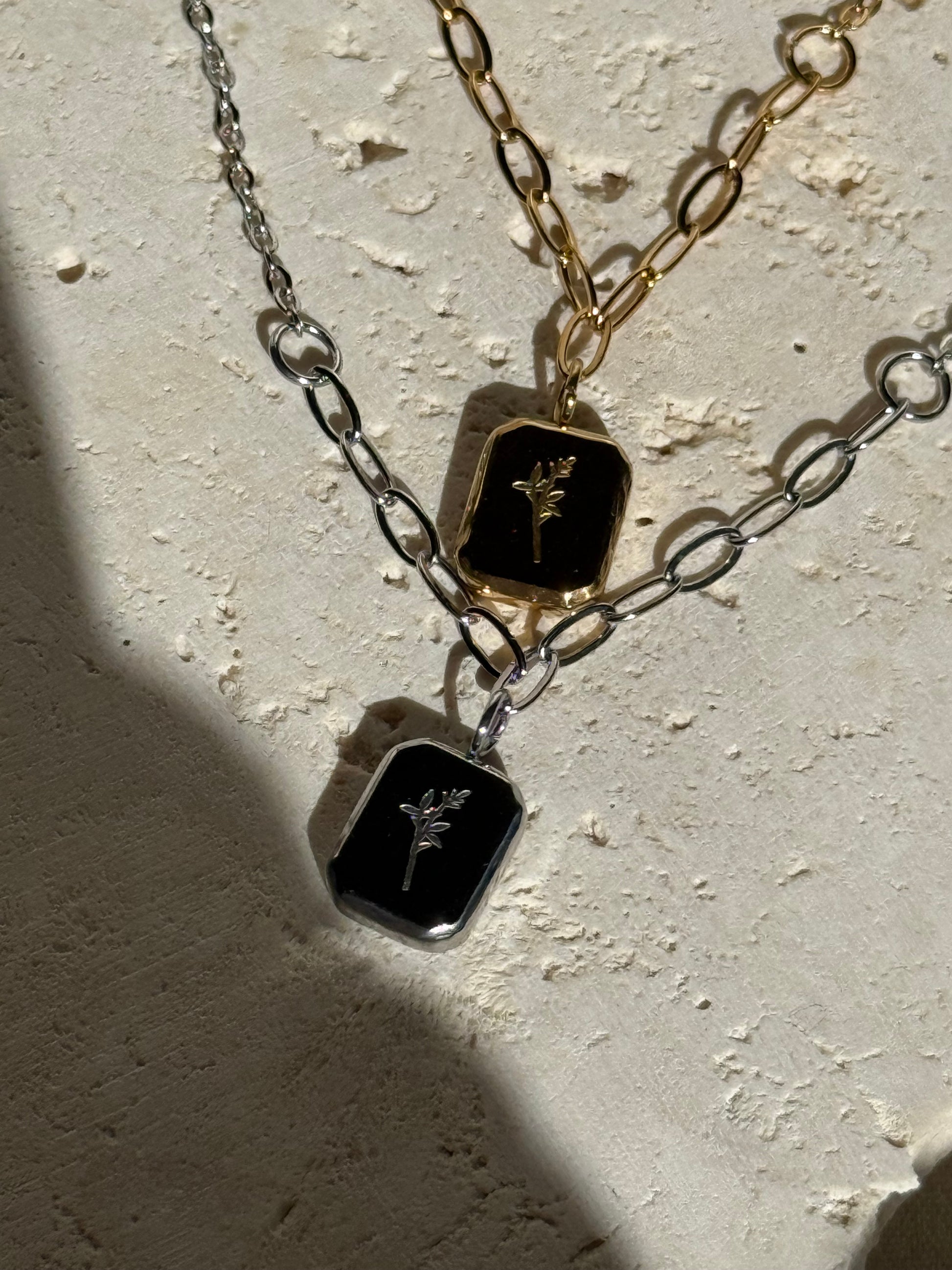 Sweet and dainty double sides pendant necklace with a wildflower & “forever love” engraved on each side.